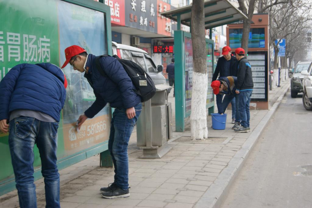 志愿者在即将毕业之际,纷纷走上淮南街头,进行公交站牌和候车棚的清洗工作。活动中,志愿者们还向来往的市民分发精心准备好的环保小常识,呼吁市民以实际行动,拒绝雾霾,提升城市形象,打造一个更加美好的淮南。
