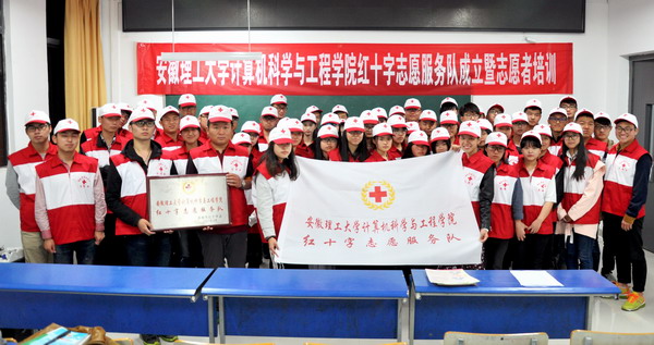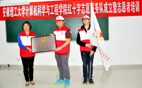 陈玉琴宣读了安徽理工大学计算机学院红十字志愿服务队成立批文并为服务队授旗、授牌。在队旗下,志愿者们在队长江超同学的带领下集体宣誓。志愿者们表示,要恪守“奉献、友爱、互助、进步”的志愿者精神,当好爱心的传播者,做好精神文明的传播者,为安徽理工大学的志愿服务活动作出表率。最后,淮南市红十字会工作人员还为志愿者进行了相关培训。