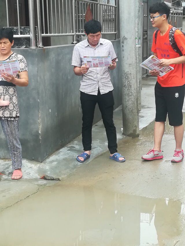 志愿者团队到访的第一站是村委会,从这里能大概了解到村里较为全面的信息。据村干部介绍当地以农业经济作物为主,种植玉米、小麦;蔬菜自给自足,村中青壮年大多不在家。第二天在村干部的陪同下,团队共走访了四户贫困家庭,深刻理解了他们的不易,并给他们送去了慰问品,同时通过图文推送、发传单、宣讲等形式宣传十九大精神和相关政策、“七五”普法规划、环保知识等。最后一天的收尾工作,每个成员认真总结了这次活动,告别了这个村。