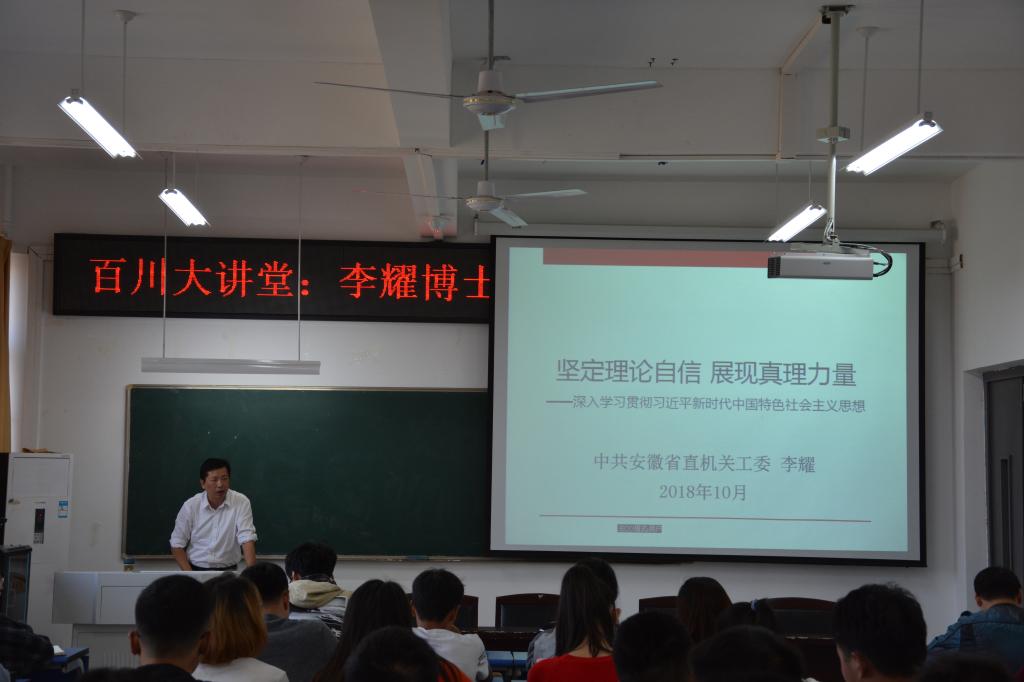 10月12日下午,党委宣传部和计算机科学与工程学院共同举办“百川大讲堂”,邀请中共安徽省直机关讲师团李耀博士在求本楼B401报告厅宣讲习近平新时代中国特色社会主义思想。报告会由计算机科学与工程学院党委书记王永祥主持。