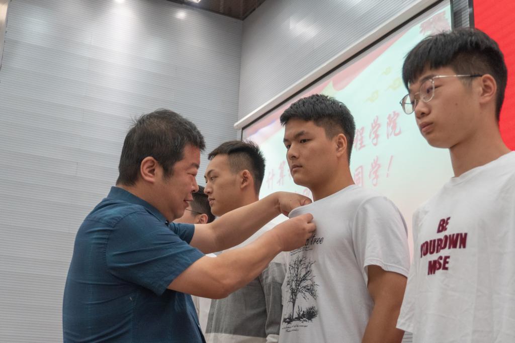 学院领导为新生佩戴校徽(摄影:崔文豪)