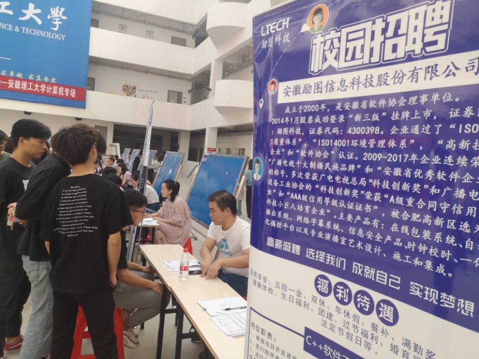 9月26日上午,计算机学院在校厚德馆举办合肥高新区计算机类专场招聘会,科大国创软件股份有限公司、安徽励图信息科技股份有限公司、合肥兆芯电子有限公司等28家企业受邀前来招聘。学院计算机科学与技术、物联网工程、数字媒体技术和信息安全专业的近200名学生参加了招聘会。