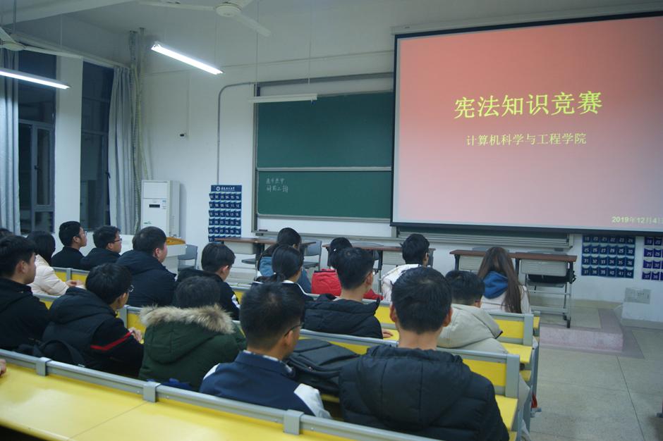 12月4日晚七点,计算机学院在明理北112开展了“宪法知识竞赛”活动。2019级全体新生参加了活动。本次知识竞赛的内容包含:总书记关于宪法的重要论述;新中国宪法发展历程,宪法的地位和作用,宪法的基本原则和主要内容;新中国成立70年来特别是党的十八大以来我国法治建设的辉煌成就等内容。本次活动进一步加强宪法法律宣传教育,帮助大学生树立宪法法律至上、法律面前人人平等的法治理念,把尊法、学法、守法、用法作为共同追求和自觉行动。
