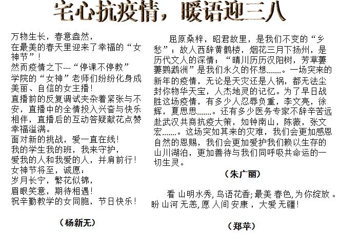 此次“战疫情、迎三八”线上女工文化活动,不仅让女教职工们在轻松愉悦的氛围中度过了一个有意义的节日,进一步凝聚了大家的力量,更树立了学院女教职工自强、自立的知性女性形象,大家纷纷表示要以实际行动在疫情防控和推动学院发展中展现巾帼风采,贡献巾帼力量。