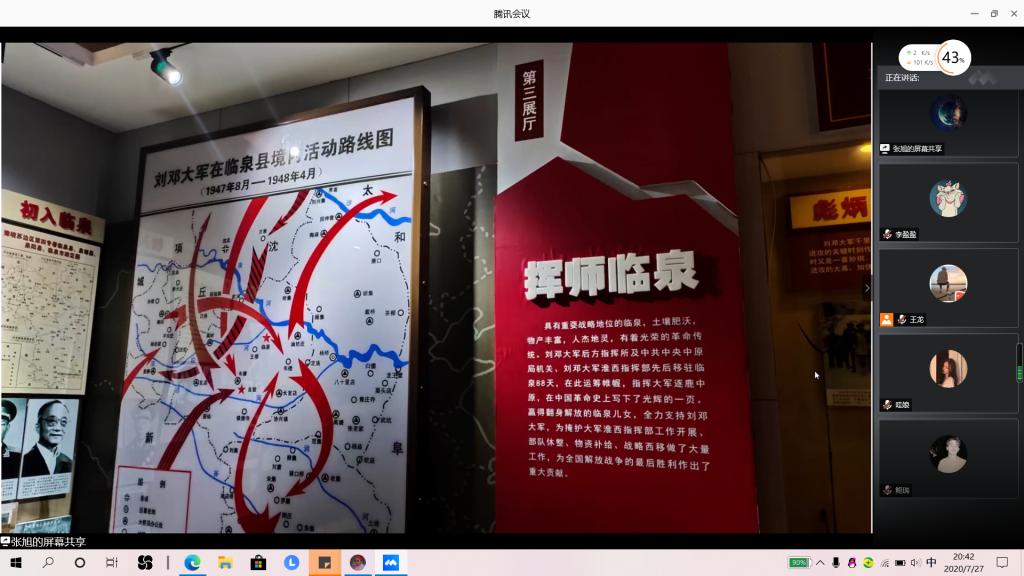 7月27日上午,借助腾讯会议“云端直播”形式,志愿者在临泉县“千里跃进大别山”纪念馆为计算机学院学子开展了一堂线上红色主题教育直播活动。志愿者们通过线上腾讯直播带领全院学子线上参观了“转折前夜”、“千里跃进”、“挥师临泉”、“精神永驻”等四个展厅,一幅幅图文并茂的宣传海报、一件件弥足珍贵的历史实物,逼真地再现解放战争时期刘邓大军在临泉激战88天的战斗场景,让所有参与线上教育的学生们真切地感受到了革命先辈们“信仰坚定、不怕牺牲”的大无畏革命精神。参观结束后,志愿者们通过组织线上集体默哀的形式向革命先辈表达哀思。