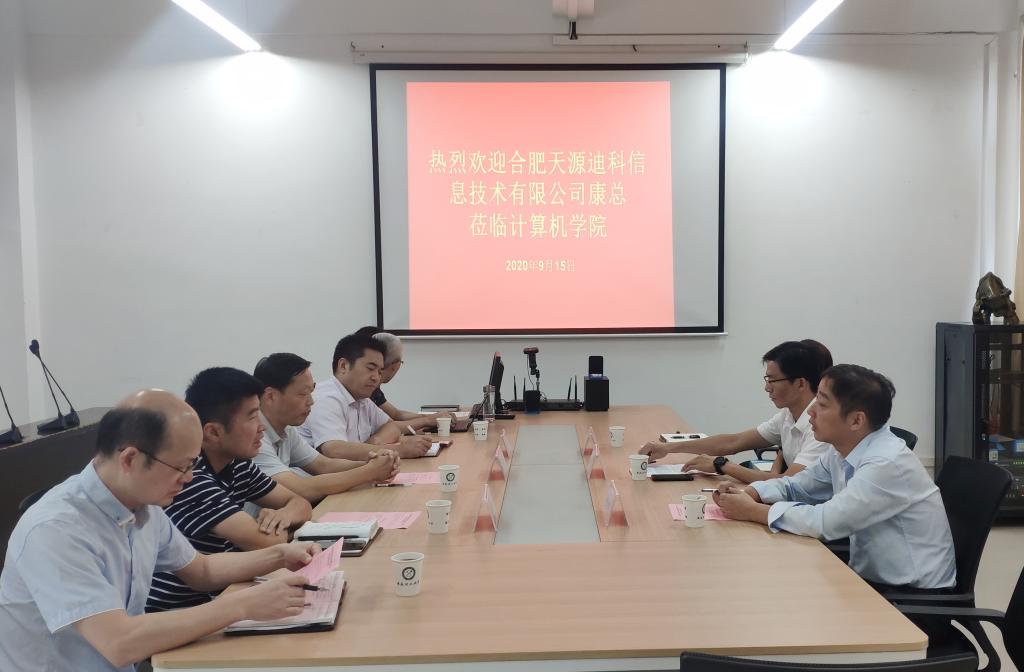 9月15日下午,合肥天源迪科信息技术有限公司康维胜一行莅临计算机学院,在求本楼B403会议室就校企合作事宜交流座谈。学院党委书记王永祥、党委副书记兼行政副院长张旸、业务副院长葛斌以及代表教师参与了本次会议。