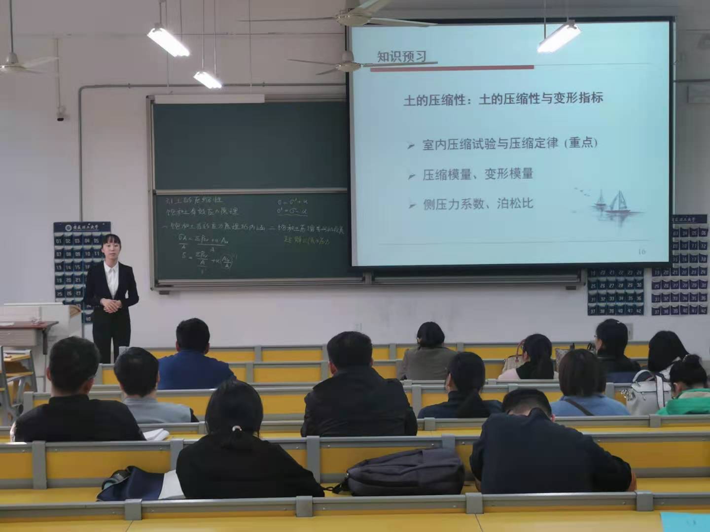 示范课上,褚程程老师以《土质学与土力学》课程中的“土的压缩性”和“饱和土压缩变形的实质”为讲授内容,采用启发式讲授、互动式交流、问题式探讨等方法进行教学。教学过程中,褚程程老师循序渐进地导入问题,声情并茂地分析讲解,思路清晰,重难点突出,工整的板书和精美的课件展示出扎实的教学功底和较强的课堂掌控能力,课堂中的课程思政内容更是升华了整场示范教学的“授业之道”。