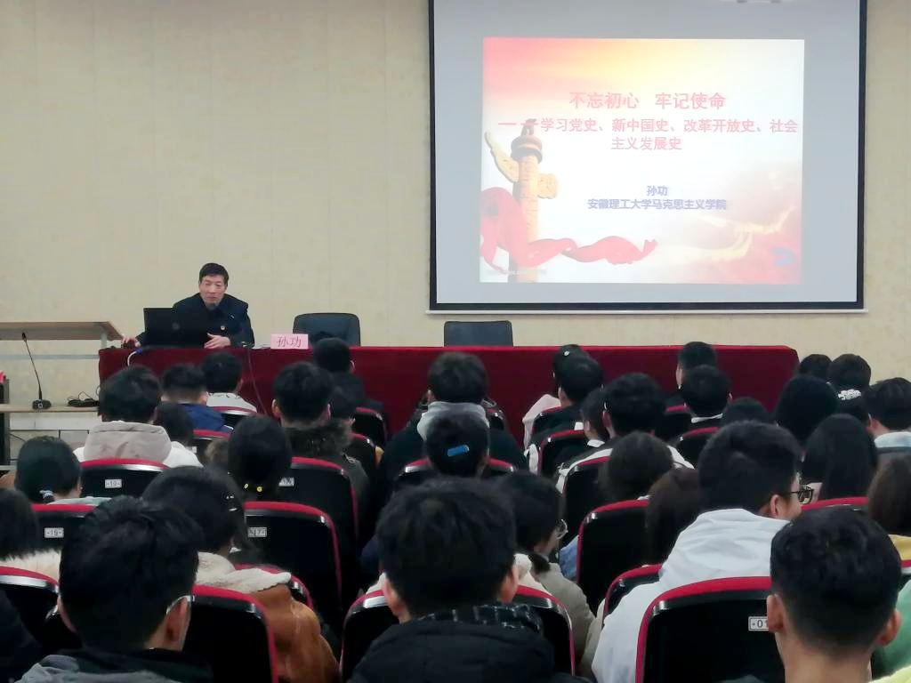 开班仪式结束后,马克思主义学院党总支书记、院长孙功教授为学员讲授《不忘初心牢记使命——学习党史、新中国史、改革开放史、社会主义发展史》专题内容。他从学习“四史”的重要性、“四史”的基本脉络、内在逻辑及根本经验四大方面,给学员们呈现了一堂生动的团课,引导学员们立足当下,回望历史,汲取奋进力量。