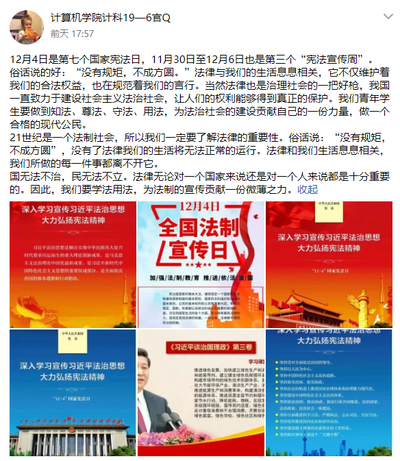12月6日晚,计算机学院组织各年级团支部开展宪法知识学习班会。各班级以宪法、民法典为主要内容,结合校园贷、网络赌博等校园常见问题,开展了以“学宪法、讲法制”为主题的班会,并组织学生观看“学宪法,讲宪法”知识竞赛节目,学生代表计算机20-4班孙凯旋同学说道:“这次活动增强了我们对宪法知识的理解和对宪法的敬畏之心,作为青年大学生我们将坚决维护宪法权威,捍卫宪法尊严,践行宪法内容,弘扬宪法精神。”