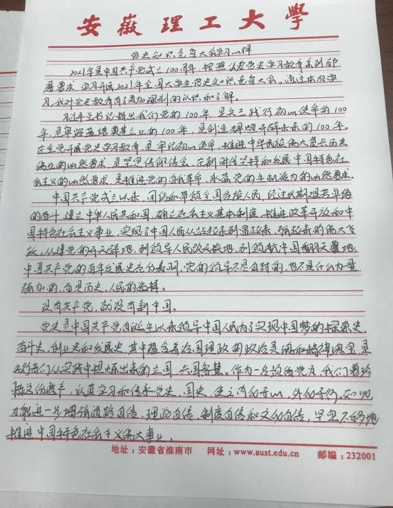 此外,学院积极组织学生党员撰写自己的党史学习心得,物联网工程18-2班陈淼谈到自己的学习心得说:“经过连续多期的观看学习,让我深有感触。正如防疫工作,出现了许许多多的“90后”、“00后”,让我也意识到,我们青年一代,应当努力奋进,用自己的肩膀扛起祖国的江山。台上的选手面对知识试题,回答的游刃有余,也让我自己深深认识到自己的不足,我们要学习党史,更加了解党,坚持党的全面领导,做一个爱党青年。”