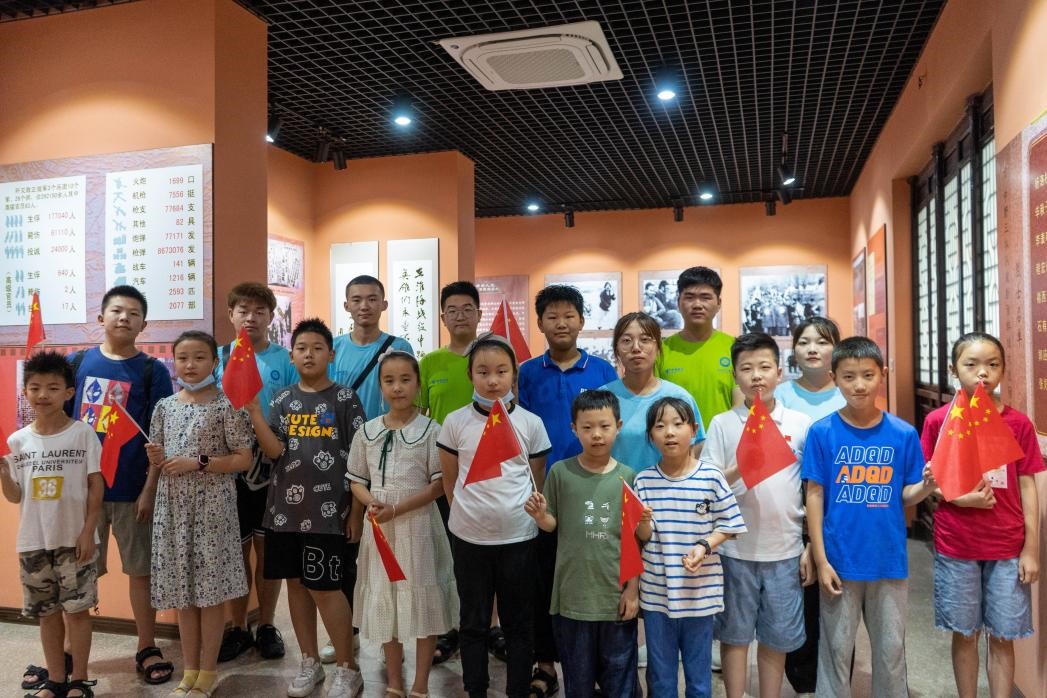 经过学习和培训后,在展馆内,志愿者队员们纷纷化身为党史故事宣讲员,耐心为前来参观纪念馆的红色暑假夏令营班的小孩子们,讲解彭雪枫将军的生平事迹与宿城和淮海战役相关的战役历史。