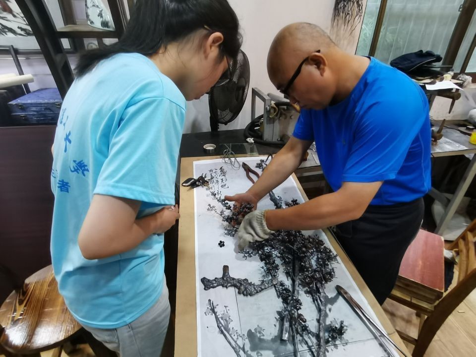 在芜湖市徽艺坊,志愿者们深入地采访和调研了铁画手艺传承人魏师傅。通过此次座谈调研,志愿者们了解到铁画作品是芜湖市特有的传统工艺美术作品,其锻造技艺于2006年列入第一批非物质文化遗产名录。同时,也了解到虽然这项技艺受到了政府的支持,但其面临着缺乏宣传,费时费力,回报率低等问题,使铁画技艺的知名度不够。铁画技艺魏师傅向志愿者们展示了铁画的制作过程,让志愿者们亲身见识和感受到了传统美学制作工艺的技术和精妙之处。