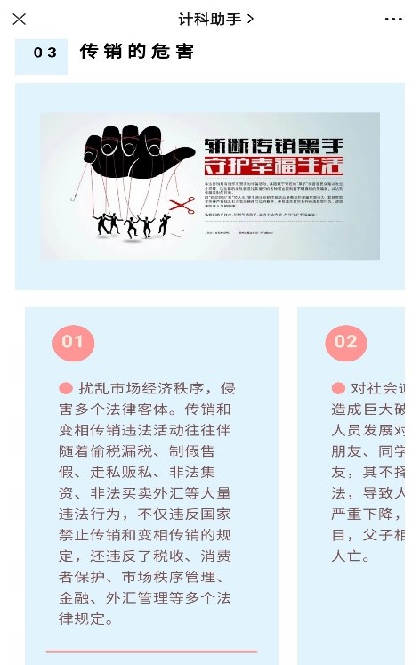 本次活动使学生对防传销防诈骗有了更深入的了解,也提升了学生安全防范意识。作为新时代的大学生,应树立正确的三观,加强理论知识学习,用科学的思想武装自己,认清传销的危害并自觉抵制传销行为。
