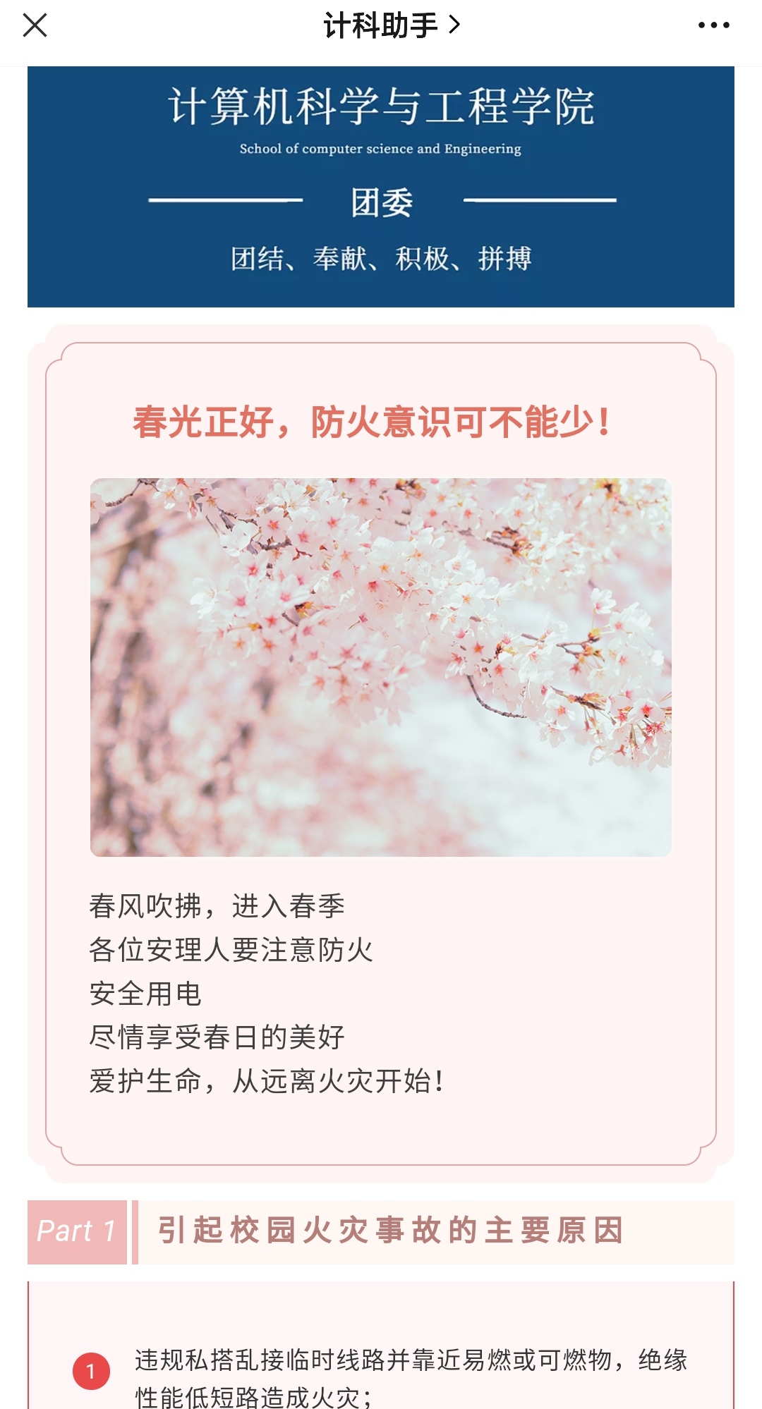 3月9日,学院通过微信公众号、计科助手等形式加强消防安全宣传教育。制定防火小贴士、宣传消防知识,让师生在潜移默化中认识到春季安全风险,同时做好防范,能够熟练掌握安全基本常识。