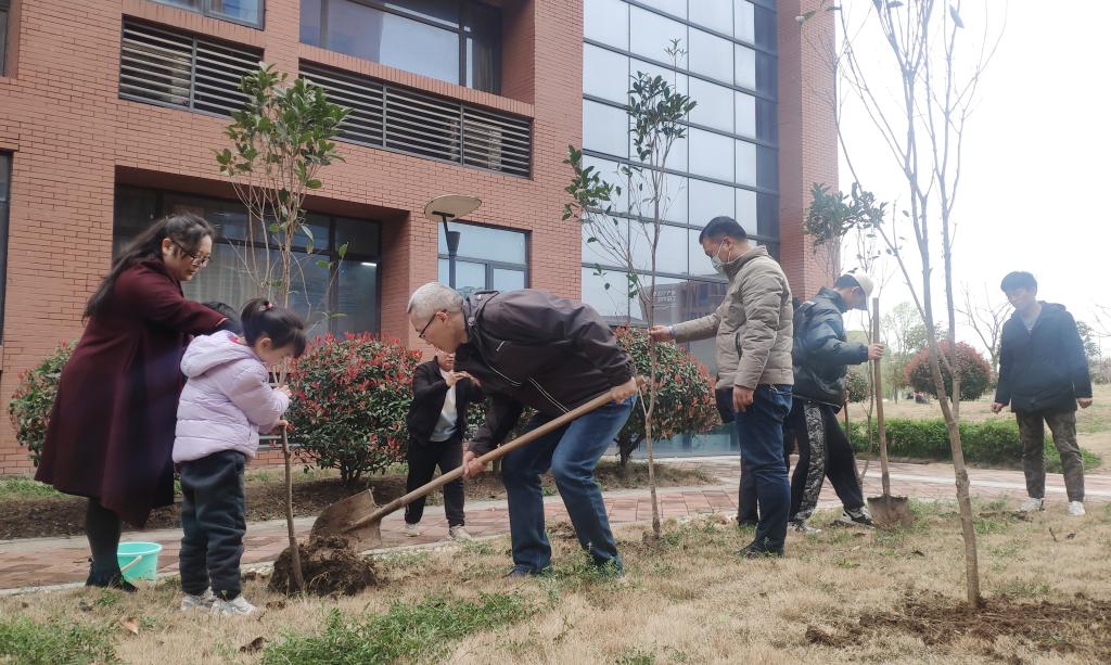 植树现场,学院分工会主席刘中廷带领教职工们铲土、预填、扶苗、培土、踩实、围坑,大家分工合作,配合默契,教职工小孩也纷纷加入植树活动,整个植树场面繁忙而有序。一棵棵栽植好的树苗迎风挺立,生机盎然,透露出浓浓春意。