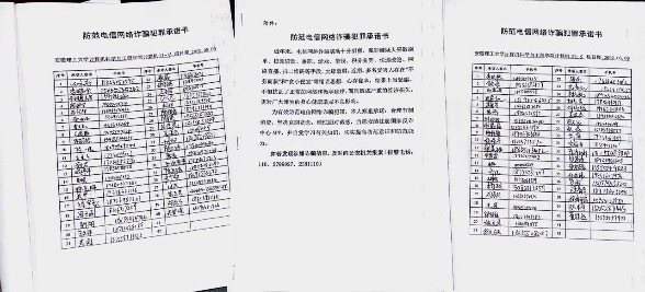 5月12日至15日,各年级辅导员通过线上主题班会,再次强调了防电信诈骗的重要性,普及电信诈骗的危害和主要表现形式,宣传防诈骗知识,组织观看防诈骗教育宣传片,带领学生学习“校园贷”、“套路贷”等诈骗常识。其次,组织学生阅读防诈骗承诺书并签字,把“签名”承诺化为防范电信网络诈骗的实际行动,提高大家的防范意识,覆盖率100%。
