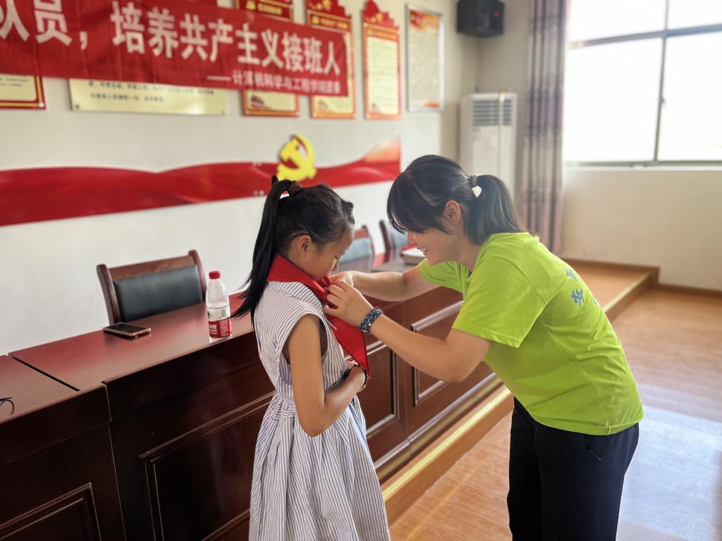 8月1日至3日,志愿者们分别来到祁门县李源村和恒峰村,在村委会的组织下,为全村留守儿童开展了暑期公益课堂。志愿者以少先队员的标志:红领巾与少先队徽为例,详细介绍了少先队员的责任和义务。并辅之以红色教育短视频,进一步增强少先队员们对少先队的理解,认识到自身的历史使命感与责任感。志愿者们细心地为每一名孩子们佩戴红领巾和少先队队徽。在齐唱少先队队歌声中,少先队员们用自己嘹亮的歌声,唱出了身为一名少先队员的光荣和自豪!