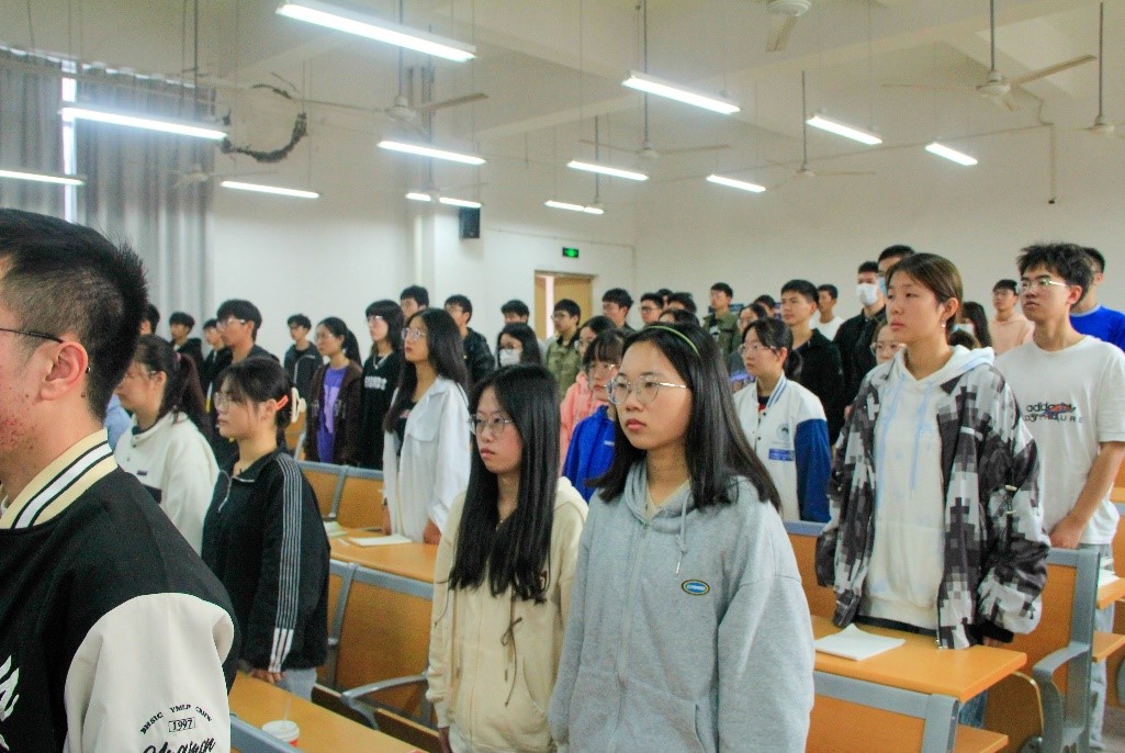 会议伊始,全体师生起立奏唱中华人民共和国国歌。