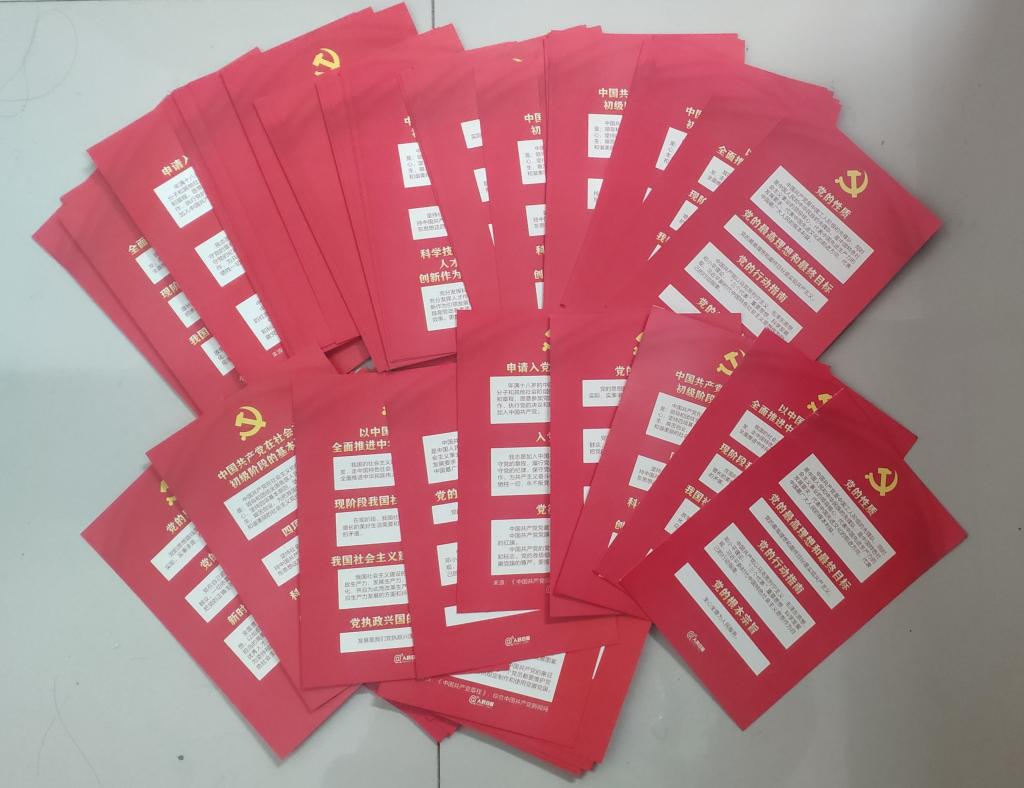 11月16日至22日,支部认真制作《中国共产党章程》学习卡片,为新发展党员分发学习卡,利用好碎片化时间学习党史,方便党员随时随地进行学习,让学生更容易将党的二十大精神贯彻好、践行好。党员之间还可以针对卡片内容进行互相提问,吸引更多党员积极主动参与到党史学习中,让党史知识更容易记,提高了党员学习兴趣,使党史学习教育入脑入心。