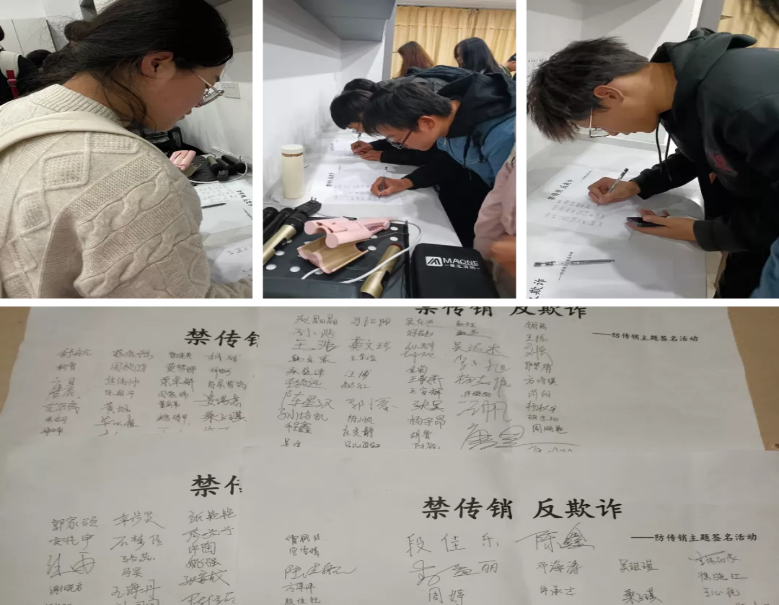 11月22日,学院组织班干部开展防传销主题签名活动,100余名学生井然有序地在印有“禁传销 反欺诈”的签名单上认真地签上了自己的姓名,表明了他们对抵制传销的清醒认识和坚定决心。这是一份沉甸甸的承诺,主题签名活动不仅使他们了解到了更多的“反传销”常识,还引导大家自觉履行反传销的义务,为创建平安校园贡献自己的力量。