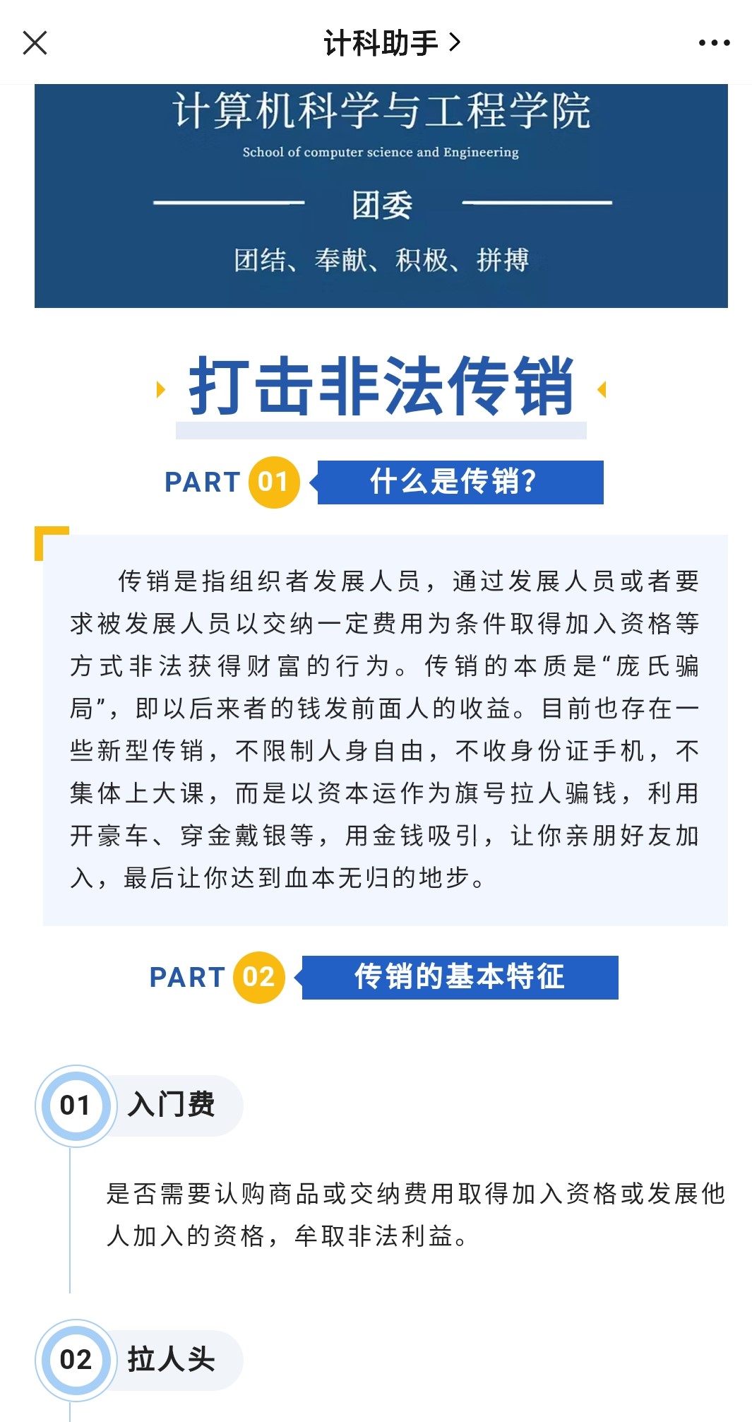 11月23日,学院通过计科助手微信公众号宣传防传销知识,采用图文并茂的形式,就传销的特征、传销危害、传销常用欺骗手段、真实案例及如何防范传销等进行了宣传,号召全体师生行动起来,积极参与反传销活动,自觉抵制传销行为。