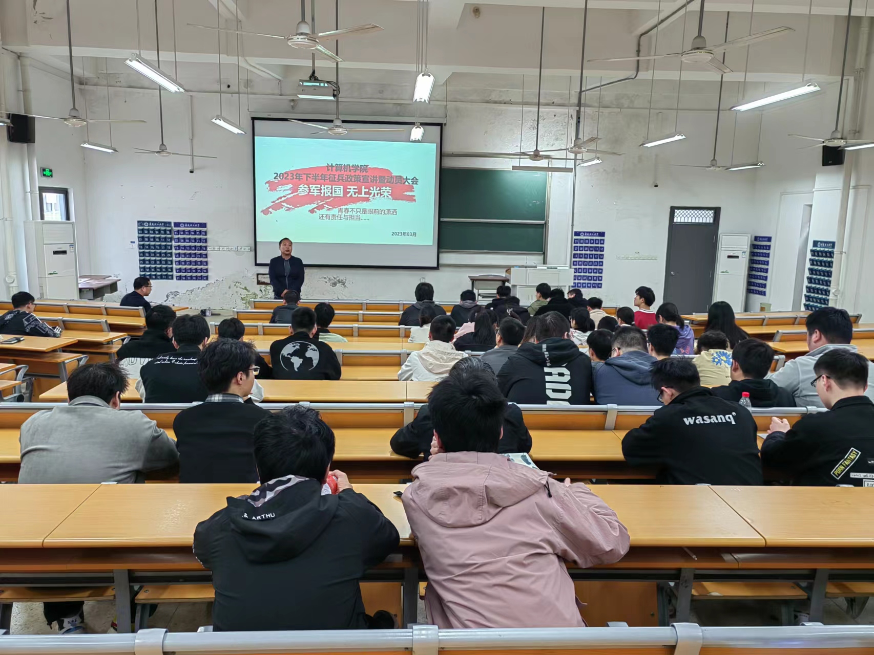 为教育学生响应国家号召,鼓励更多大学生投身军营,3月28日下午,计算机学院在天工105 教室召开2023年下半年征兵政策宣讲暨动员大会。学院党委副书记刘中廷、学院征兵联系人、毕业班辅导员、毕业班学生以及低年级有入伍意向的学生参加大会,动员会特别邀请校征兵工作站老师进行征兵政策解读。