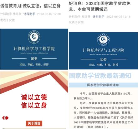 搭建线上学习平台。5月31日至6月5日,学院借助问卷星平台,举办线上学生资助诚信知识竞答,了解学生的金融知识储备,题目涵盖国家资助政策、个人征信、学术诚信、考试诚信、贷款还款和防范诈骗等方面的知识,科学、准确地检验了同学们对于有关诚信知识的掌握程度,540名同学参与此次竞答。学院还通过“计科助手”微信公众号,搭建诚信知识线上学习平台,通过各班级转发,引导学生自觉树立诚信意识。