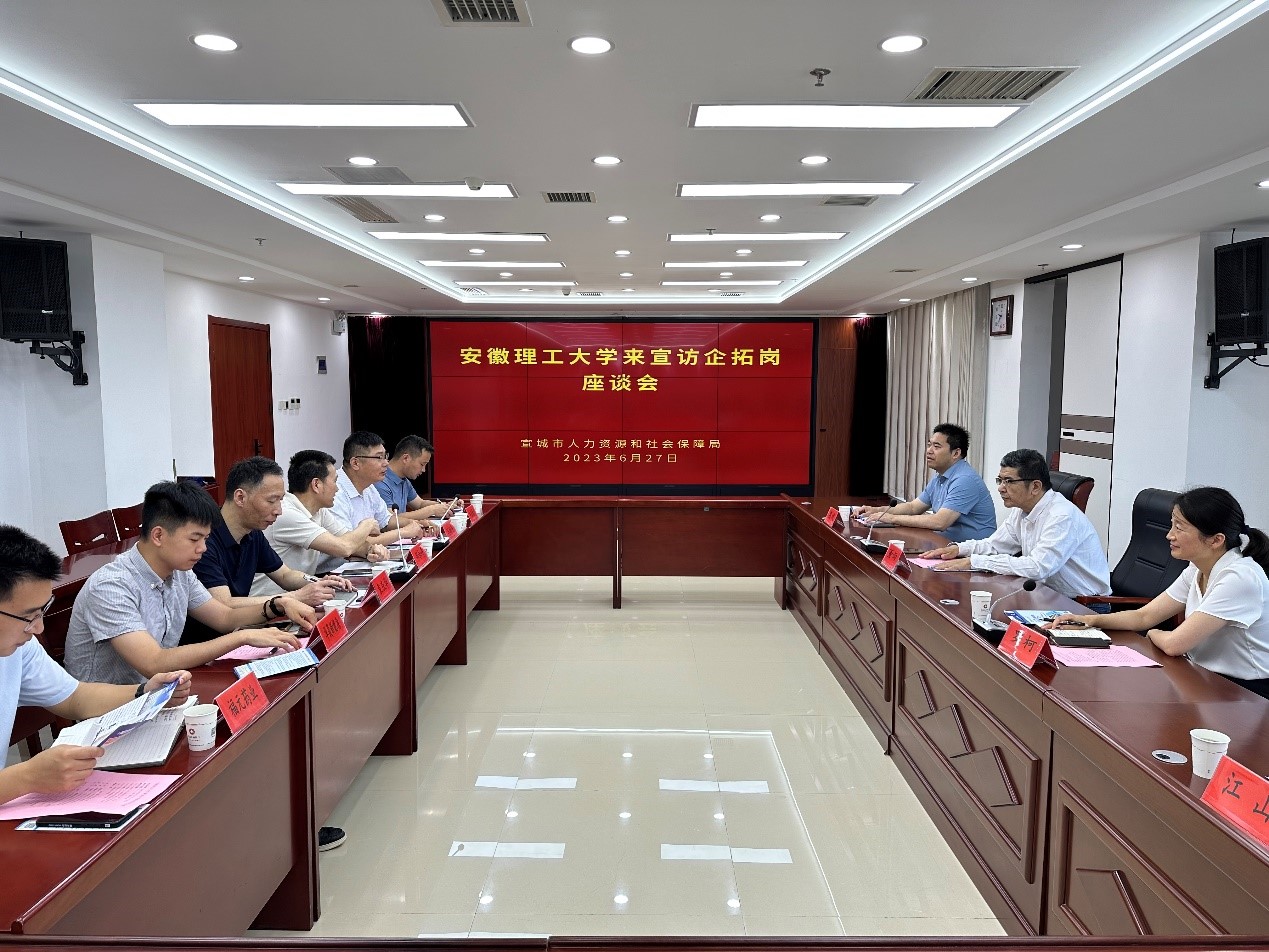 宣城市人力资源和社会保障局党组成员、副局长邵和平对董雨一行表示热烈欢迎,介绍了宣城市发展情况,希望以此活动为契机,以学校的人才优势助力宣城市及其企业发展,以企业的技术优势提升学校人才培养质量,实现优势互补、资源共享、合作共赢。与会的5家企业负责人分别介绍了公司人才需求情况,期待与学校进行深入合作。