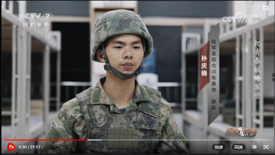 2023年,孙庆楠积极响应党和国家的号召,怀抱参军报国、保家卫国的坚定信念,通过层层严格的体格检查、政治考核、役前训练等程序,顺利过关,光荣入伍!在新兵连的刻苦训练中,孙庆楠经历了从优秀的“白面书生”到刚强军中战士的成长蜕变,被央视CCTV7国防军事频道的《国防故事》栏目作为新兵典型报道。