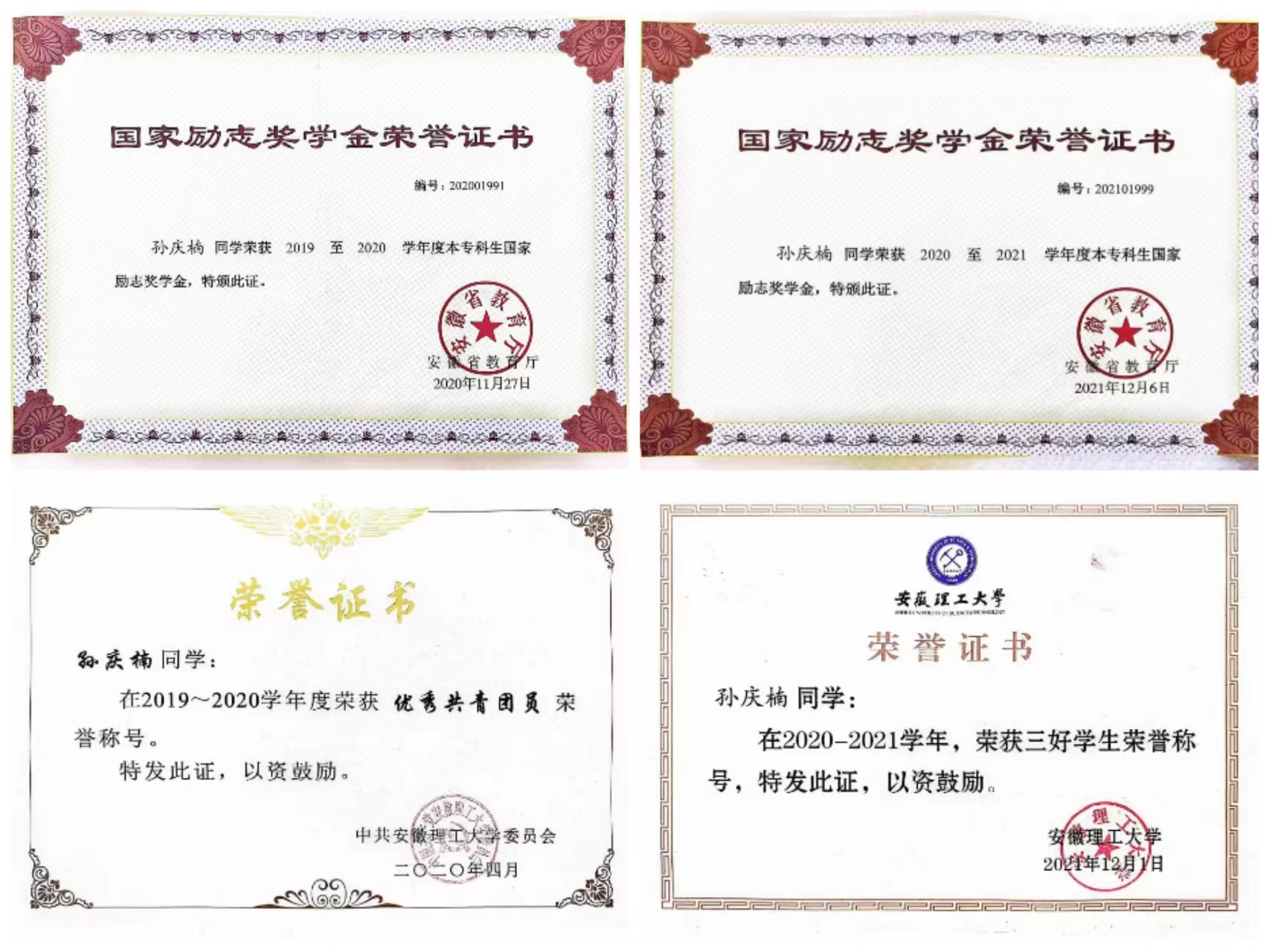 孙庆楠出生在安徽阜阳一个普通的农民家庭,家庭经济的困顿并没有使他意志消沉,反而激发了他刻苦学习、努力奋斗的决心和斗志。在校期间,他珍惜生活中的每一分钟努力学习,教室、图书馆都留下了他昼夜苦读的身影,两次获得国家励志奖学金和三好学生、同时还获得了校内奖学金、校优秀共青团员等荣誉称号,临近毕业又被评为省级双优生。
