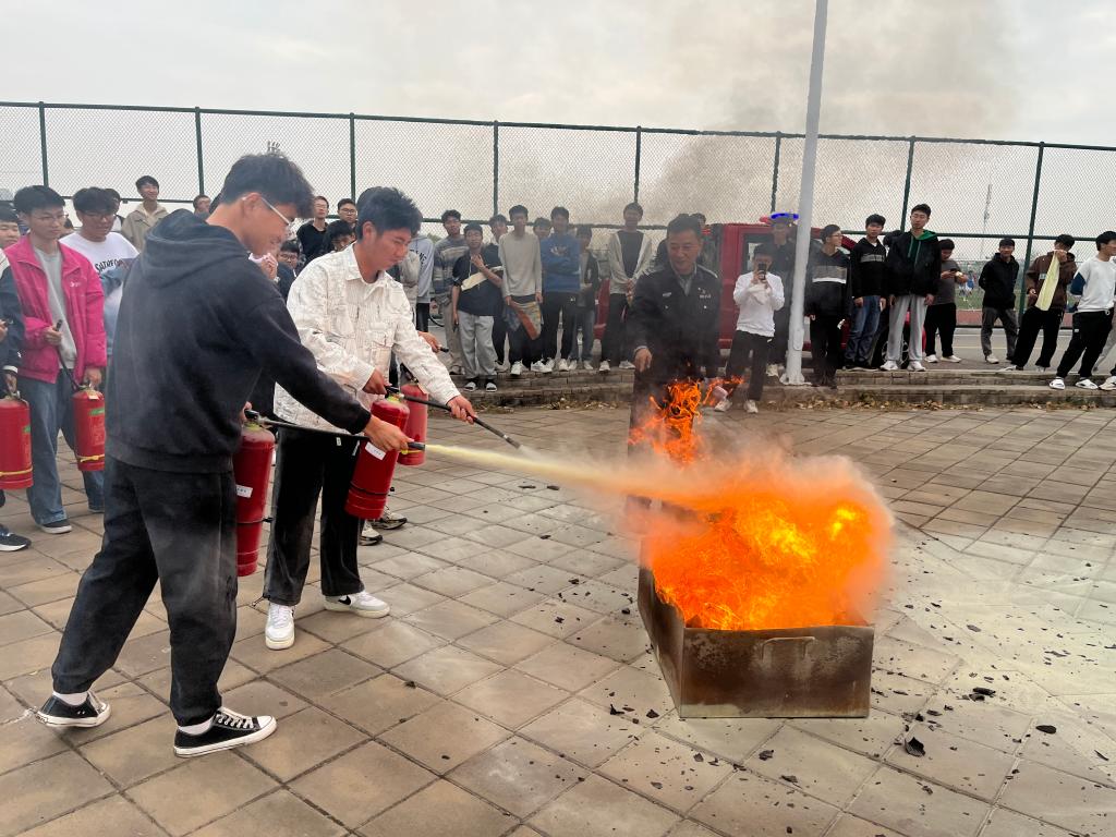 随后,保卫处彭广峰老师现场对学生进行消防安全知识讲解和实战灭火演习,讲解了灭火器的正确使用方法。在灭火实战演练中,学生们分组使用干粉灭火器进行操作演练,取得了良好的效果。