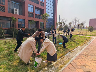 植树现场,支部书记蒋社想带领师生党员铲土、扶苗、培土、踩实、浇水,大家分工合作,配合默契。一棵棵栽植好的树苗迎风挺立,生机盎然,透露出浓浓绿意,勾勒出“党建红”与“生态绿”相融合的美丽风景线。