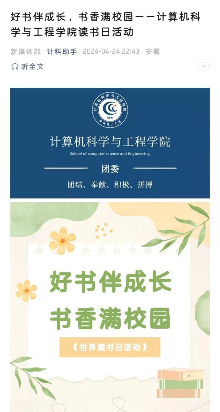 为倡导全民阅读,营造浓厚的校园阅读氛围,不断拓宽大学生的阅读视野,提升人文素养,4月1日至4月30日,计算机科学与工程学院组织开展了以“好书伴成长,书香满校园”为主题的读书月系列活动。