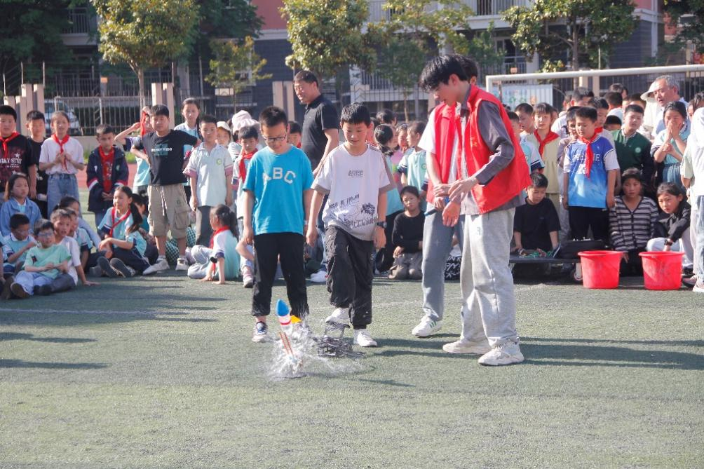 随后,志愿者们带领小学生来到操场开展机器人现场展示活动,志愿者们运用生动的语言和直观的演示手段,向小学生们展示了仿生蝴蝶和RoboMaster步兵机器人的设计灵感及其在科技领域的应用。在机器人小游戏环节中,志愿者们手把手地指导小朋友们制作并发射水火箭,并耐心解释了水火箭的原理。通过游戏和现场展示,加深了小朋友对机器人相关的科学知识,还体验到了实践操作的乐趣,进一步点燃了小学生们科学探索的热情。