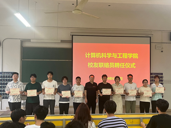 为增进校友与母校的感情,凝聚校友的智慧和力量,6月5日下午,计算机学院在天工南110举行了2024届毕业生校友联络员聘任仪式。学院党委书记王永祥、学生工作负责人、毕业班辅导员及新受聘的校友联络员参加仪式。