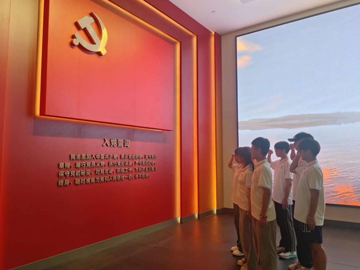 实践队队员们怀揣着对革命历史的敬仰之情,前往南湖纪念馆进行了思想洗礼的参观学习。纪念馆展厅一幅幅珍贵的历史照片、一件件生动的实物展品,详细展现了中国共产党从诞生到壮大的光辉历程。无数革命先辈和中国共产党人英勇无畏、艰苦奋斗的精神在志愿者们心中留下了深刻的印记,也更加坚定了他们为中华民族的伟大复兴而奋斗努力的决心。在鲜红的党旗面前,志愿者们一同重温入党誓词,铿锵有力的宣誓声展现了志愿者们继承革命遗志、践行初心使命的坚定信信心。