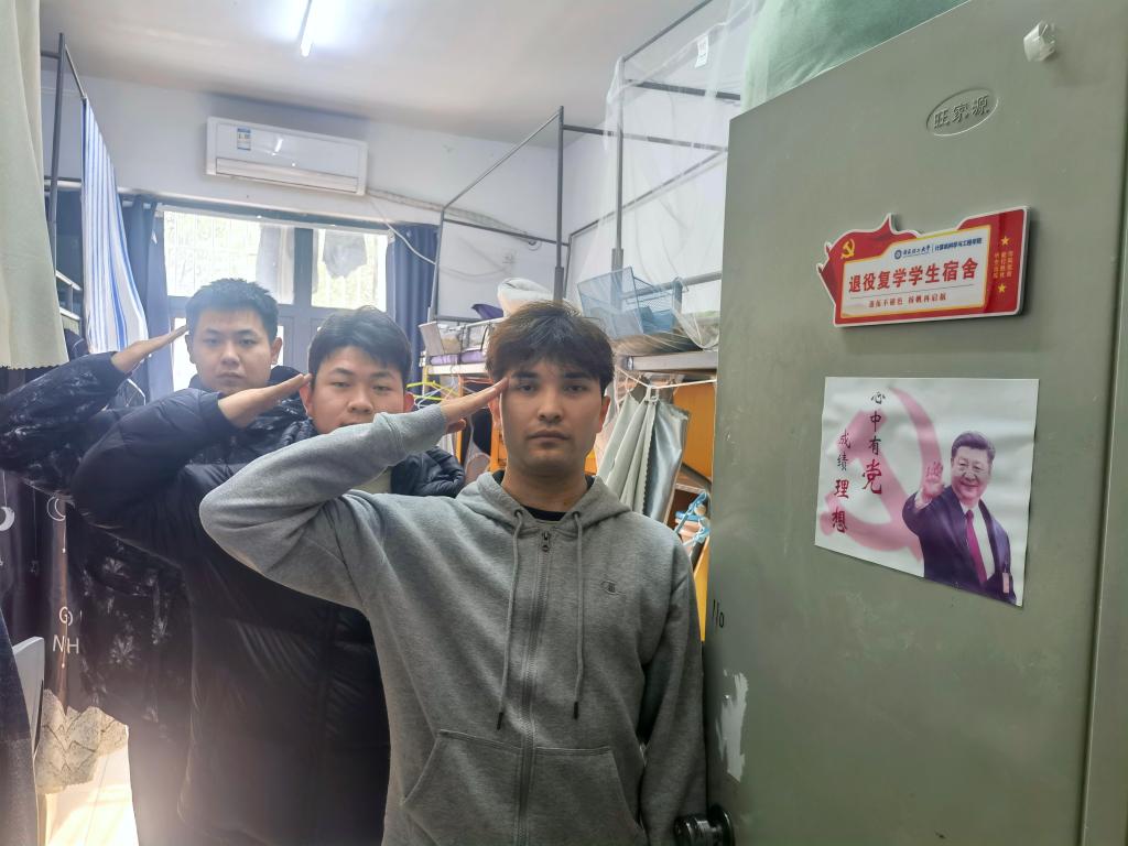 为退役复学学生艾克帕尔江·热合木 、郭超飞、毛海楠宿舍挂牌(摄影:陈卓)