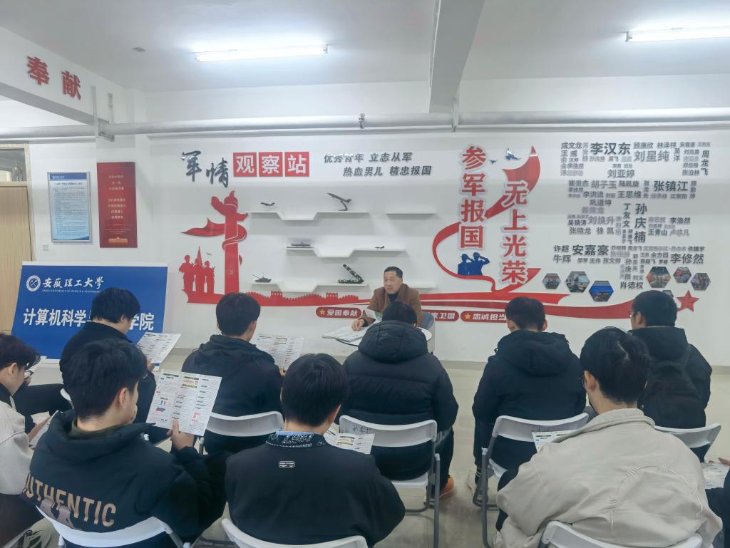 12月6日,计算机科学与工程学院邀请党委武装部征兵办公室徐意刚老师进学院“一站式”学生社区,面向2025届毕业生中有征兵意向的重点动员对象做了一次生动的座谈。座谈会围绕征兵体检事项、优抚政策、晋升发展等展开,做到“政策最新、用情最深、反馈最快”,用真实的事例打动学生,为同学们答疑解惑,现场互动积极,反响强烈。