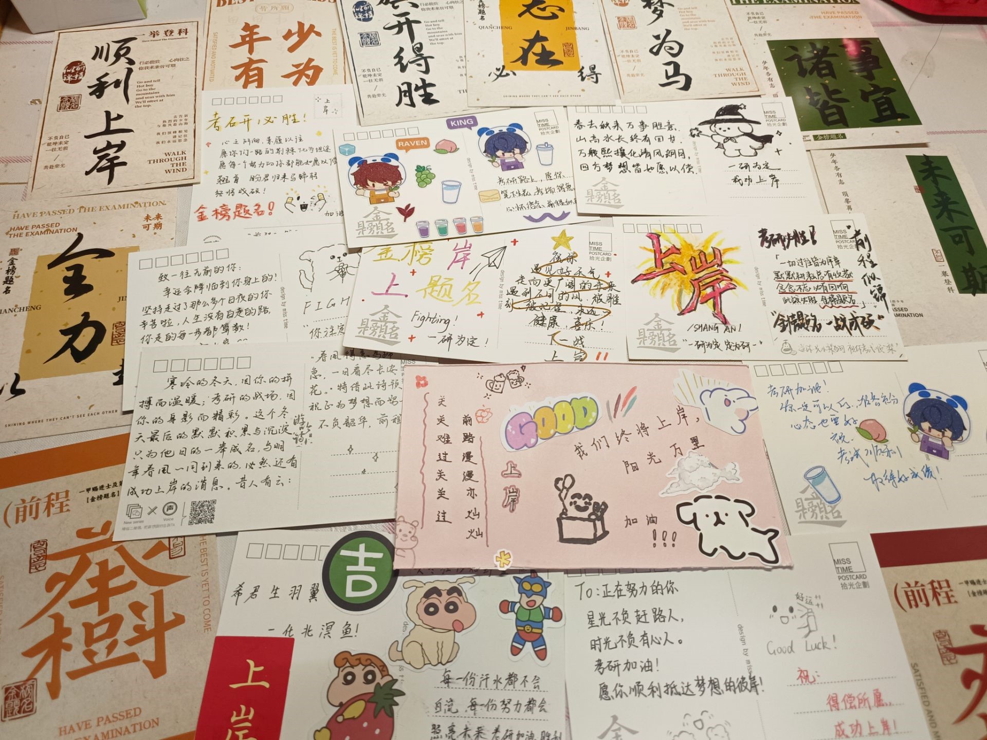 学生党员为考研学子书写考研加油贺卡,每一张贺卡都代表了一份期待,每一句鼓励的话语都表达了同学们的美好祝愿,希望2025届考研学子在最后关头能够细心沉稳、沉着应考、坚持到底,祝愿学长学姐们凯旋归来。