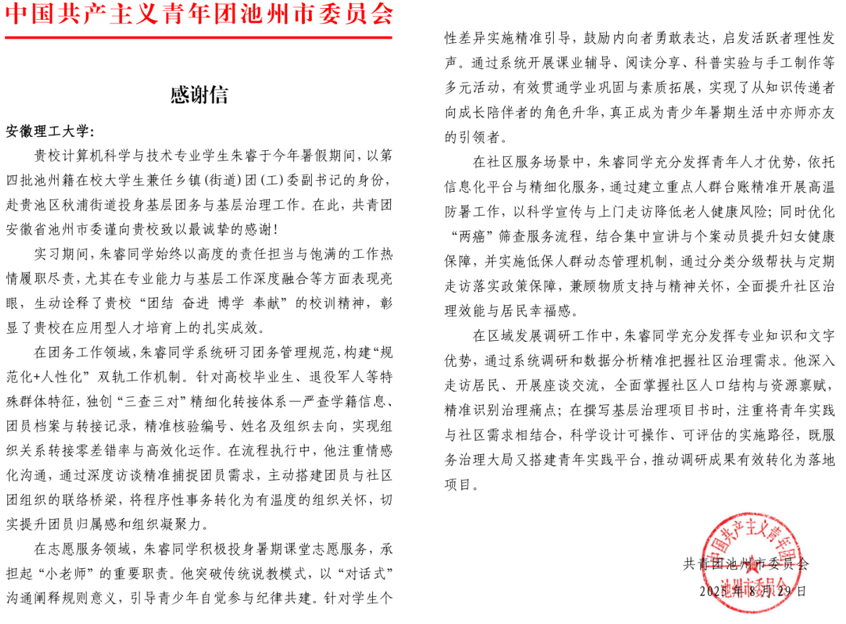 近日,共青团池州市委员会向我校发来感谢信,表彰计算机科学与工程学院计算机23-5班朱睿同学在兼任贵池区第四批乡镇(街道)团(工)委副书记期间所做的贡献。