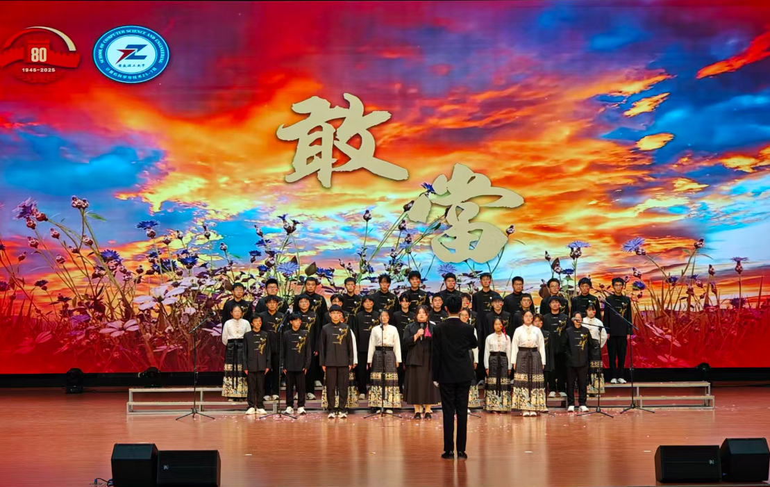 比赛在雄壮的国歌声中拉开序幕,2025级新生班级有序登台演唱。纪念中国人民抗日战争暨世界反法西斯战争胜利80周年推广曲《敢当》唱出了守护国家的赤诚情怀和民族担当,《如愿》以温情旋律传递对家国安宁、世代传承的深切祈愿,《我的战鹰绕着宝岛飞》抒发对祖国统一的坚定信念,《紫荆花盛开》唱响团结和谐、共筑繁荣的愿景。参赛班级还创新融入器乐表演、情景演绎、诗文朗诵等表现形式,将对祖国的崇敬、对学校的热爱、对未来的憧憬融入每一段旋律,充分展现了计科学子的青春风貌。