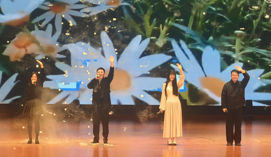 表彰大会结束后,2026新年联欢会在欢腾的开场舞《What’s love》中拉开帷幕,13个节目有序进行。《是妈妈是女儿》《春暖花开》等歌曲唱出师生对美好的向往,小品《X计划》与情景剧《外卖风波》真实再现校园生活,朗诵《血泪与荣光》抒发了对祖国的热爱,中国舞《青花瓷》与汉服秀《汉中游》展现出强烈的文化自信。晚会在激昂的团委会歌合唱中圆满落幕。