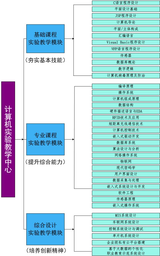 计算机实验教学中心按照学生年级的不同构建了三个实验教学模块,包括基础课程实验教学模块、专业课程实验教学模块、综合设计实验教学模块等(见图1)。各模块自成体系,共同组成中心的实验(实训)教学体系。