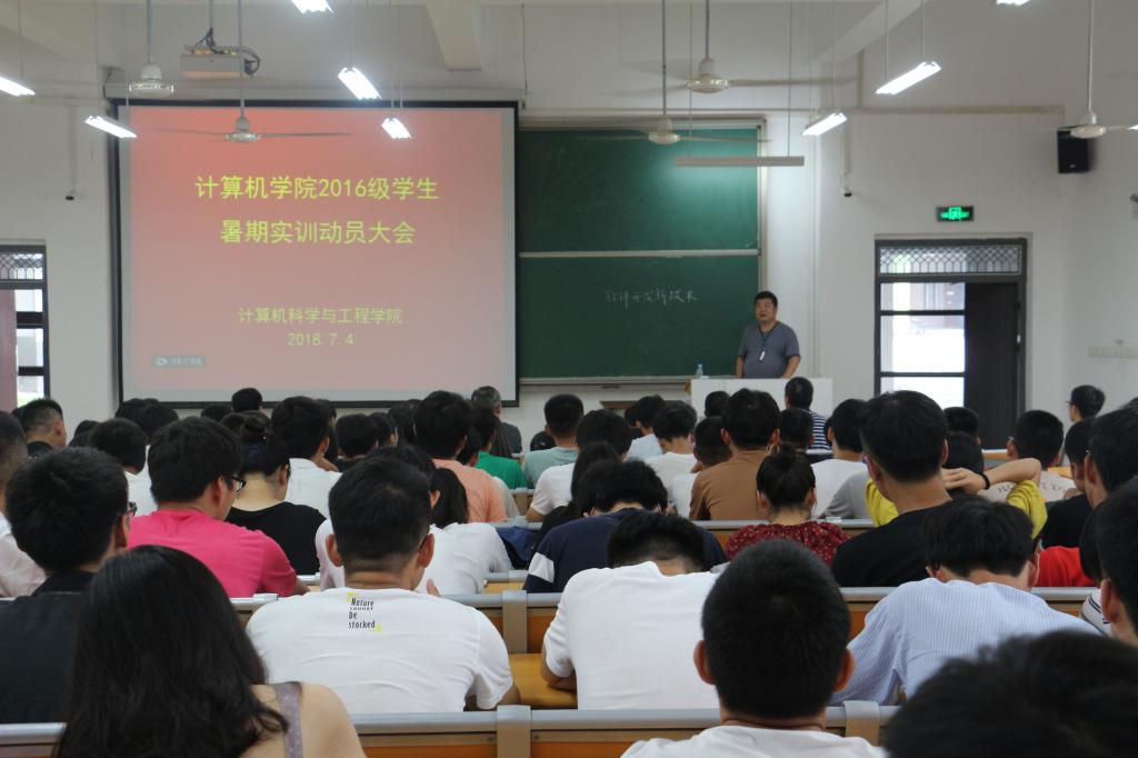 7月4日下午,计算机科学与工程学院在天工101教室召开2016级学生暑期实训动员大会。学院执行院长赵前进,业务副院长方贤进、学院党委副书记兼行政副院长张旸、各班实训指导教师及2016级计算机科学与技术专业全体学生参加了此次动员大会。会议由学院党委副书记兼行政副院长张旸主持。