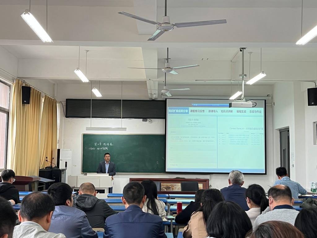 蒋社想为全院教师讲授示范课,主讲课程《数据结构》第二章“线性表”,他从知识扩展成果分享、课前预习反馈、航天员名字连接问题导入、思维导图点明重难点、知识点讲解、总结与作业等环节层层深入,思路清晰,深入浅出、课堂氛围浓厚。与会教师纷纷表示,此次示范课知识扩展丰富,内容安排合理,让人受益匪浅。