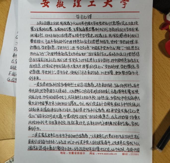 此外,学院积极组织学生党员撰写自己的党史学习心得,物联网工程18-2班陈淼谈到自己的学习心得说:“经过连续多期的观看学习,让我深有感触。正如防疫工作,出现了许许多多的“90后”、“00后”,让我也意识到,我们青年一代,应当努力奋进,用自己的肩膀扛起祖国的江山。台上的选手面对知识试题,回答的游刃有余,也让我自己深深认识到自己的不足,我们要学习党史,更加了解党,坚持党的全面领导,做一个爱党青年。”