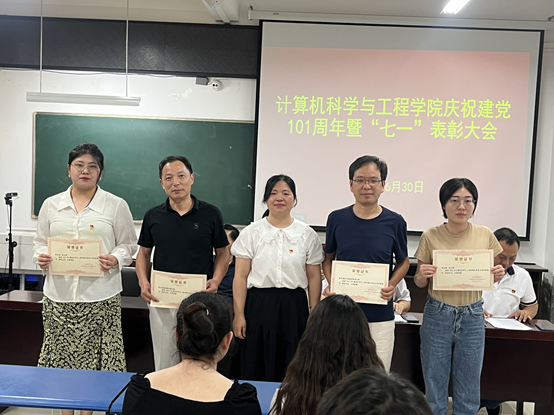 学院副院长葛斌宣读了学院《关于表彰计算机科学与工程学院先进党支部、优秀共产党员、优秀党务工作者、最佳主题党日活动的决定》,对4个先进党支部、7名优秀共产党员、4名优秀党务工作者和1个最佳主题党日活动进行表彰,学院领导为获奖个人和集体颁奖。