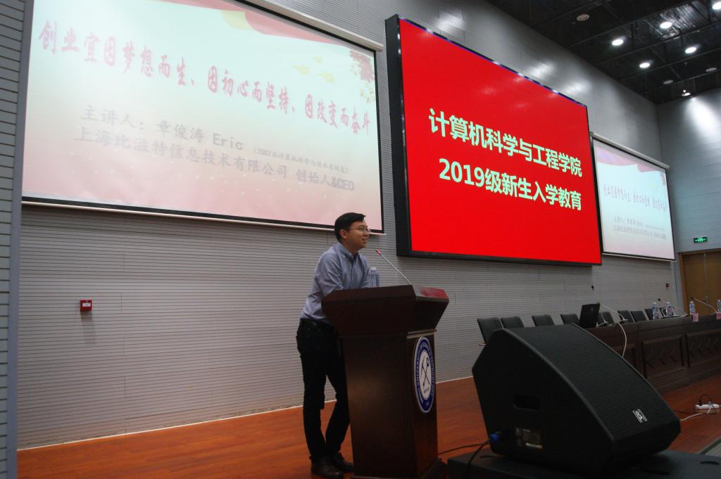 2007届计算机专业校友、上海比滋特信息技术有限公司创始人章俊涛总经理为新生做了一场题为《创业宜因梦想而生、因初心而坚持、因改变而奋斗》的校友报告,章俊涛学长享了十几年汽车行业创业的心路历程,谈到了自己.从创业公司的生存法则,谈到如何修炼成功,如何实现自己的人生目标和人生价值,结合自身创业的心路历程,勉励大家人生可选择的路有很多,创业不是唯一的路,但一定是最艰辛的路,却也是最精彩的路,告诫学弟学妹们要积极抓住时代机遇,勇于迎接挑战,坚持入学时的初心,一路逐梦。他还鼓励同学们积极创新,把创新和创业紧密结合,拥有自己的核心技术非常重要,要诚信做人、做事,赢得他人的尊重;在校期间积极参加各类创业大赛、职业技能大赛以及各类社会实践活动,不断提高自身与人沟通的能力和过硬的专业知识水准,为自己未来的创业和求职奠定良好和坚实的基础。