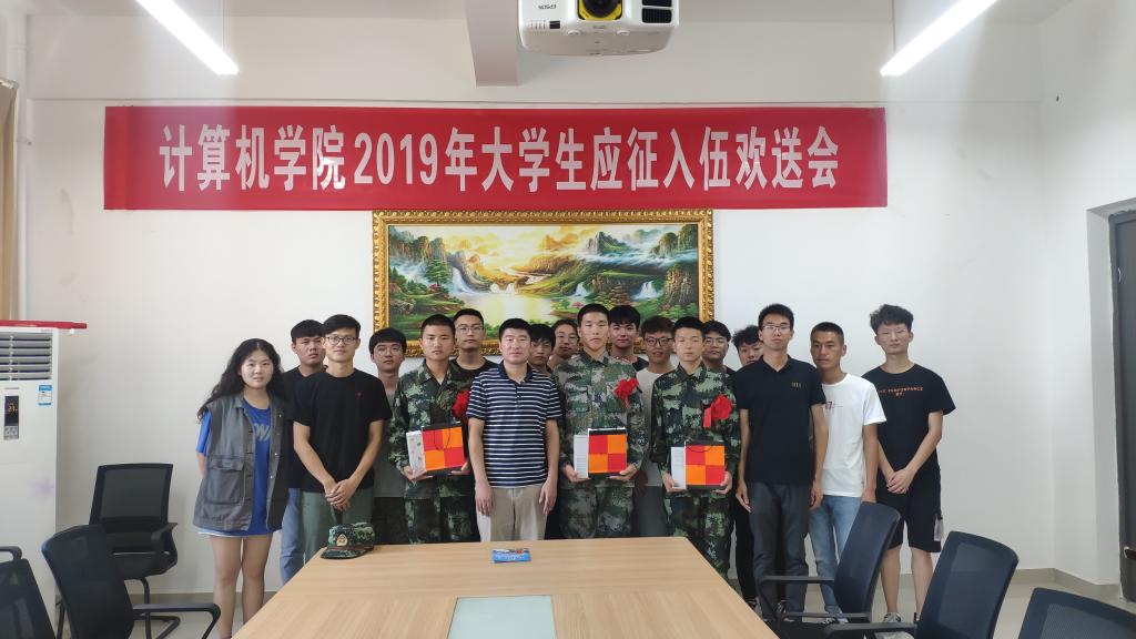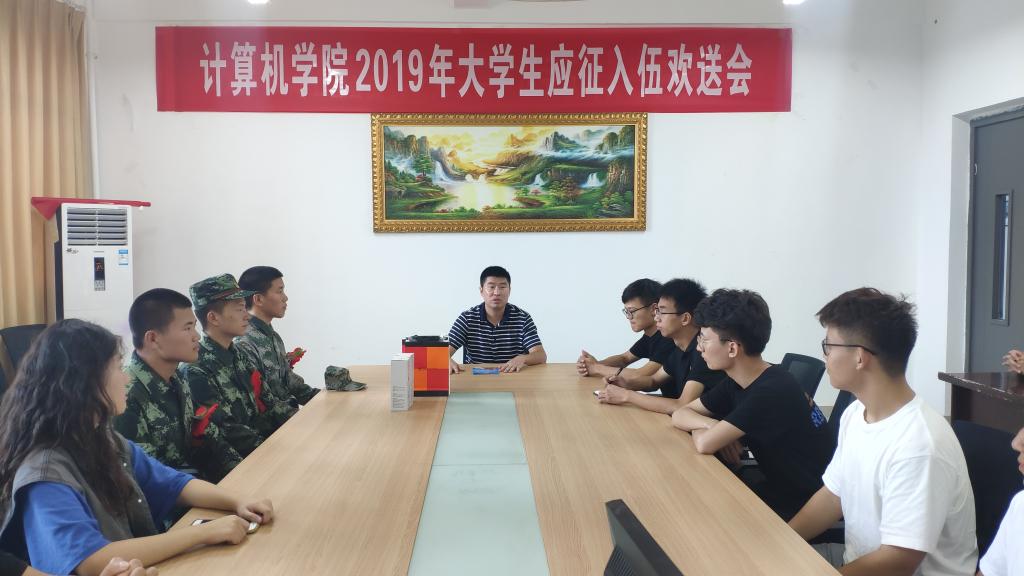 9月10日上午,计算机学院在学院楼B403会议室举办了2019年大学生应征入伍欢送会,欢送学院信息安全17-1班李志凯、计算机科学与技术18-1班乔明辉以及软件工程18-1班王荣海3名大学生光荣入伍,计算机学院党委副书记兼行政副院长张旸,学生辅导员及同学代表参加了欢送会。