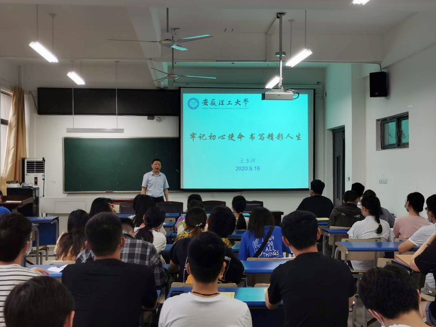 王永祥为毕业班党员讲授《牢记初心使命 书写精彩人生》专题党课。王永祥从牢记初心使命、学好扎实本领、服务国家建设、健康平安快乐四个方面展开内容。通过引入讲解习近平总书记系列重要讲话精神,贴合学生实际事例,王永祥要求毕业生不忘初心,与新时代同行,树立正确的就业观、人生观,将自己的理想信念融入到国家的发展事业中,牢记责任与担当,并在毕业离校之际,做文明离校的模范,展现党员风采。